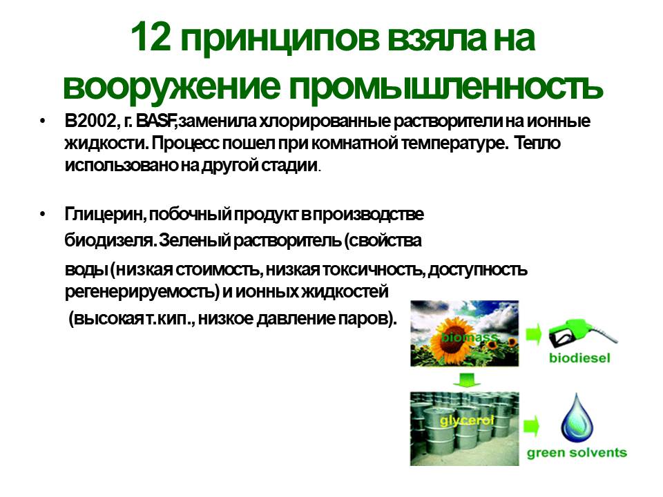 В последние годы в мире становится популярным новый подход к производству химических веществ – «зелёная» химия, или химия в интересах устойчивого развития. Если химик руководствуется этим подходом, он способен заменить опасные растворители на экологически приемлемые, например, на воду, или вообще обойтись без растворителя при проведении процесса. Он может на стадии планирования синтеза предусмотреть снижение количества образующихся отходов с использованием одностадийных реакций вместо многостадийных, каталитических вместо стехиометрических; он может заранее изучить возможную токсичность химических продуктов для природы и для человека. Важно также учесть затраты на производство энергии, необходимой для химического производства, иначе самый чистый химический процесс станет опасным из-за образования отходов при производстве энергии. Самое интересное заключается в том, что, если ученые и производственники руководствуются «зелёным» подходом, процессы получаются не только экологичными, но и высокоэкономичными. Как написал один из основоположников этого подхода, П. Анастас: «Лучшие химики мира занимаются «зелёной» химией, потому что «зелёная» химия – это просто часть занятий хорошей химией».