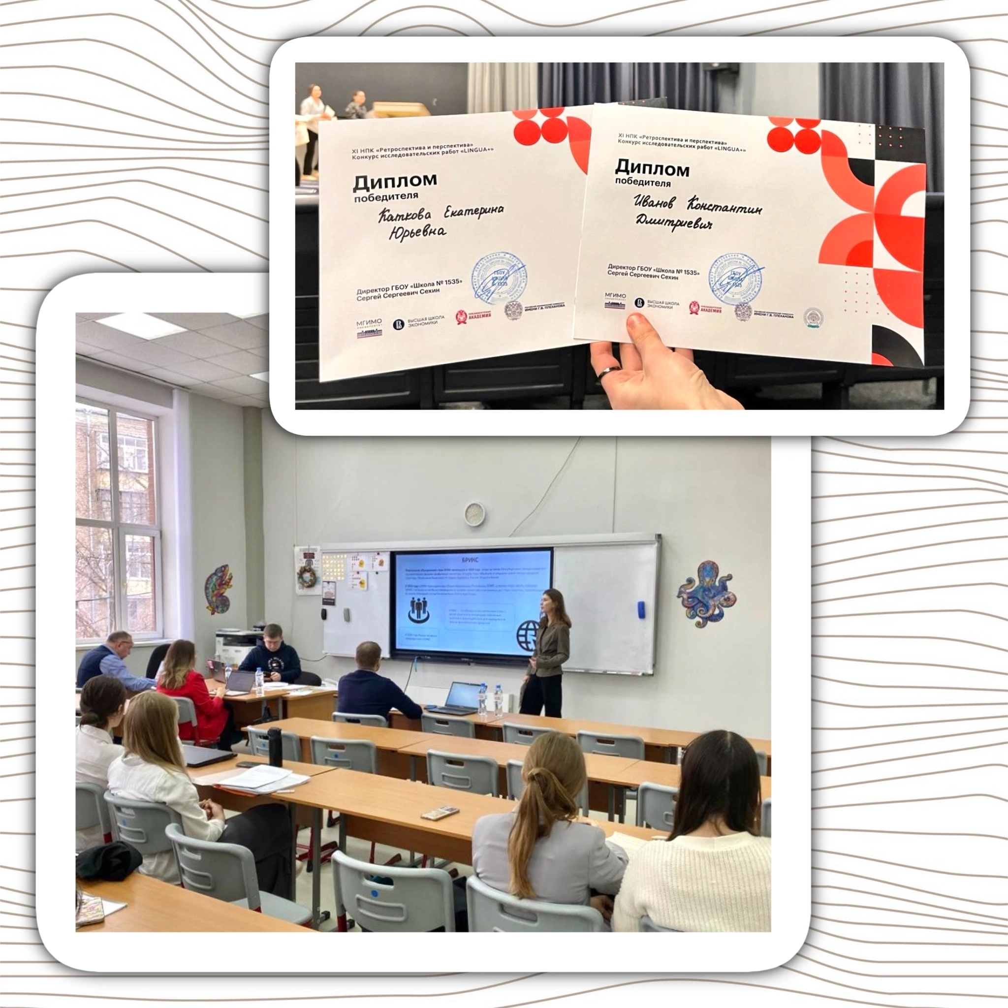 Работы учеников 10 «В» и 10 «А» классов Лизы, Кати, Вани, Алисы, Лизы, Даши, Яны, Ульяны, Кати и Кости успешно прошли заочную экспертизу и вышли на очный этап конкурса.