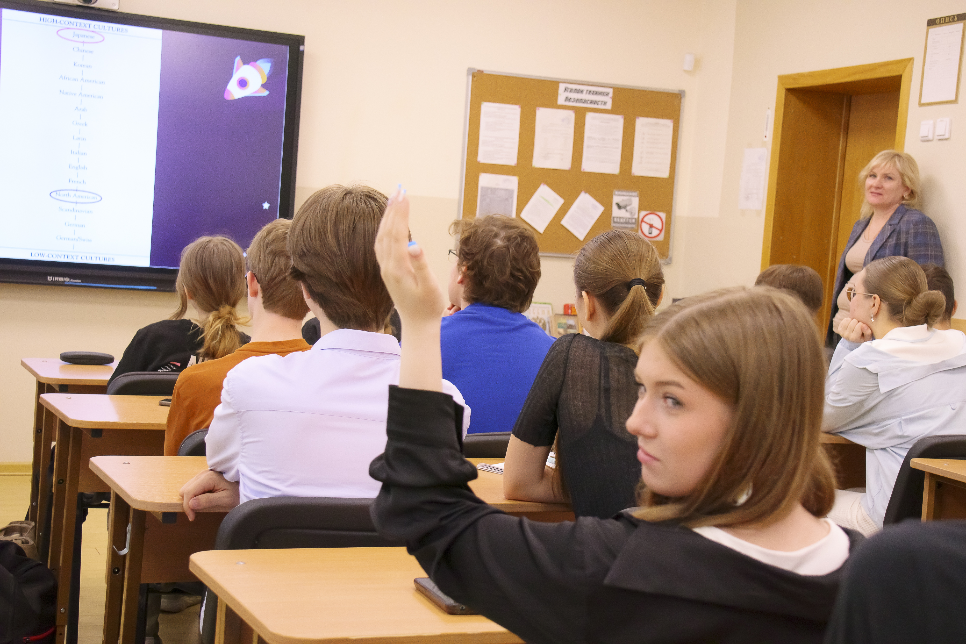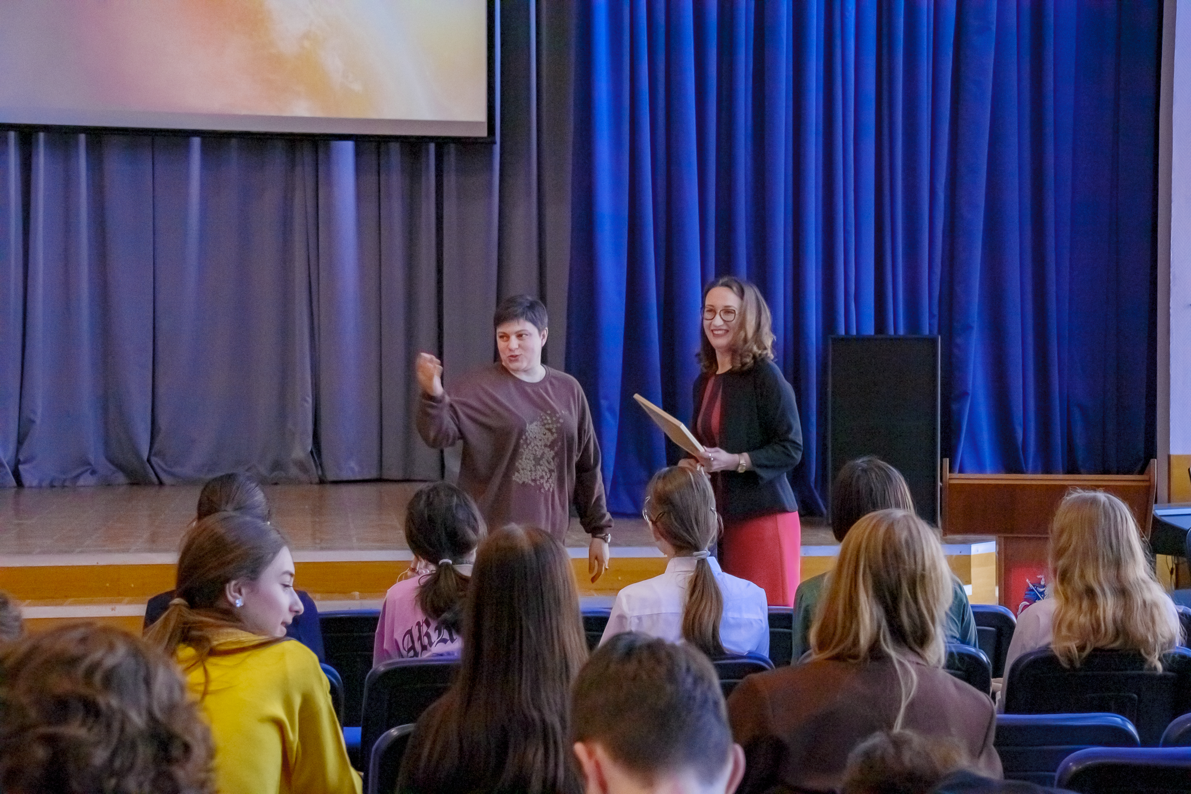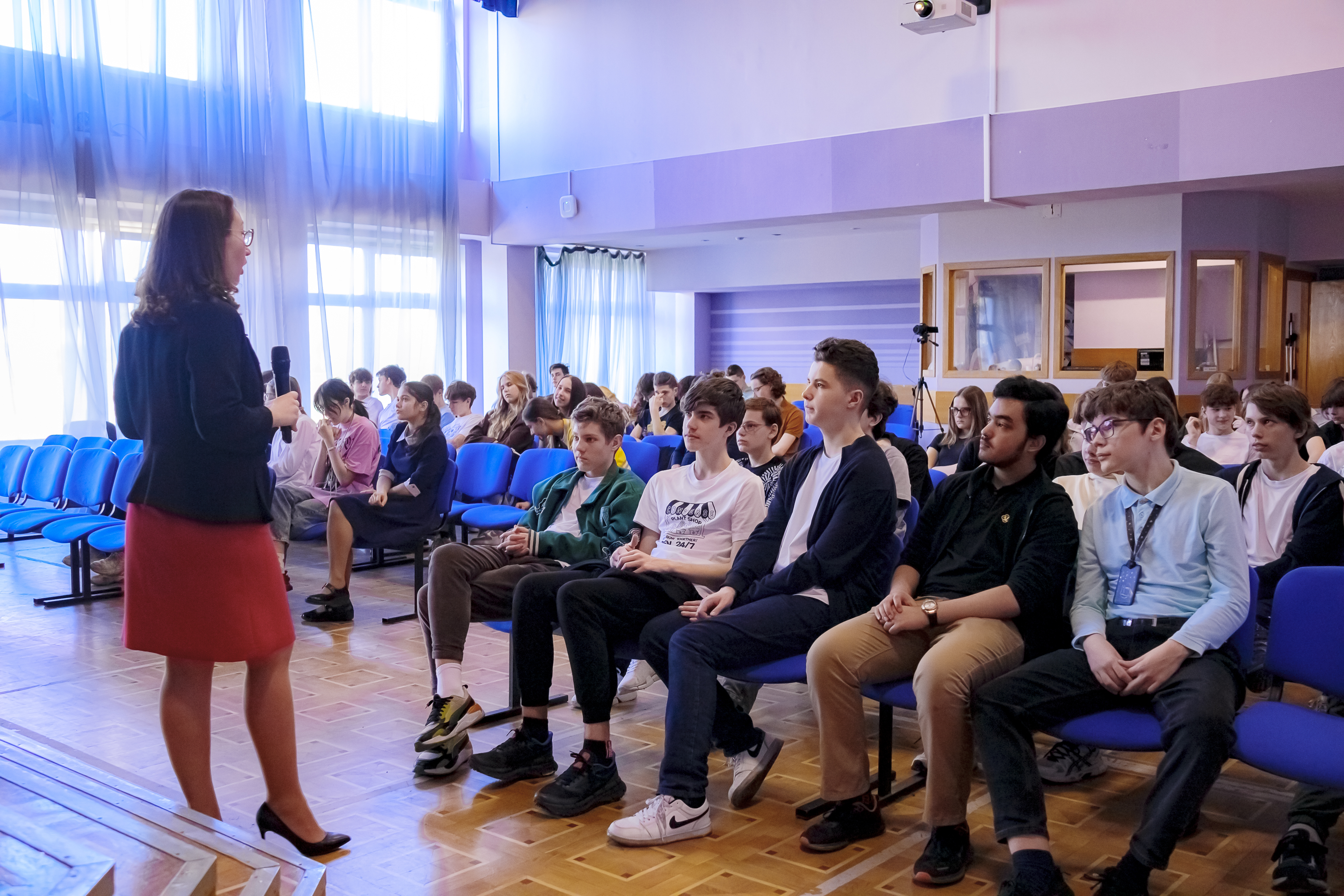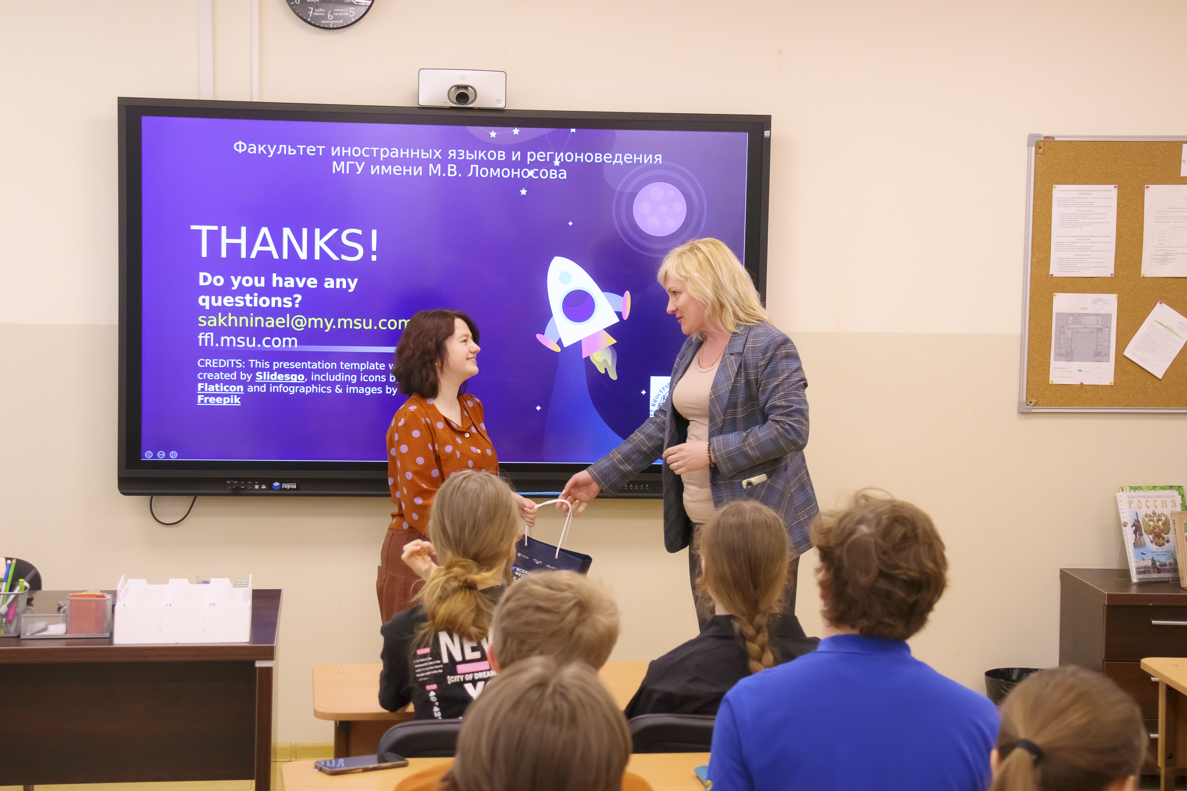 О коммуникации на Международной космической станции ученикам десятых классов рассказала преподаватель кафедры лингвистики, перевода и межкультурной коммуникации МГУ Елизавета Леонидовна Сахнина. Примечательно, что лекция прошла на английском языке. Ученики узнали о специфике общения в условиях космоса и о том, какие языки используются астронавтами разных стран.