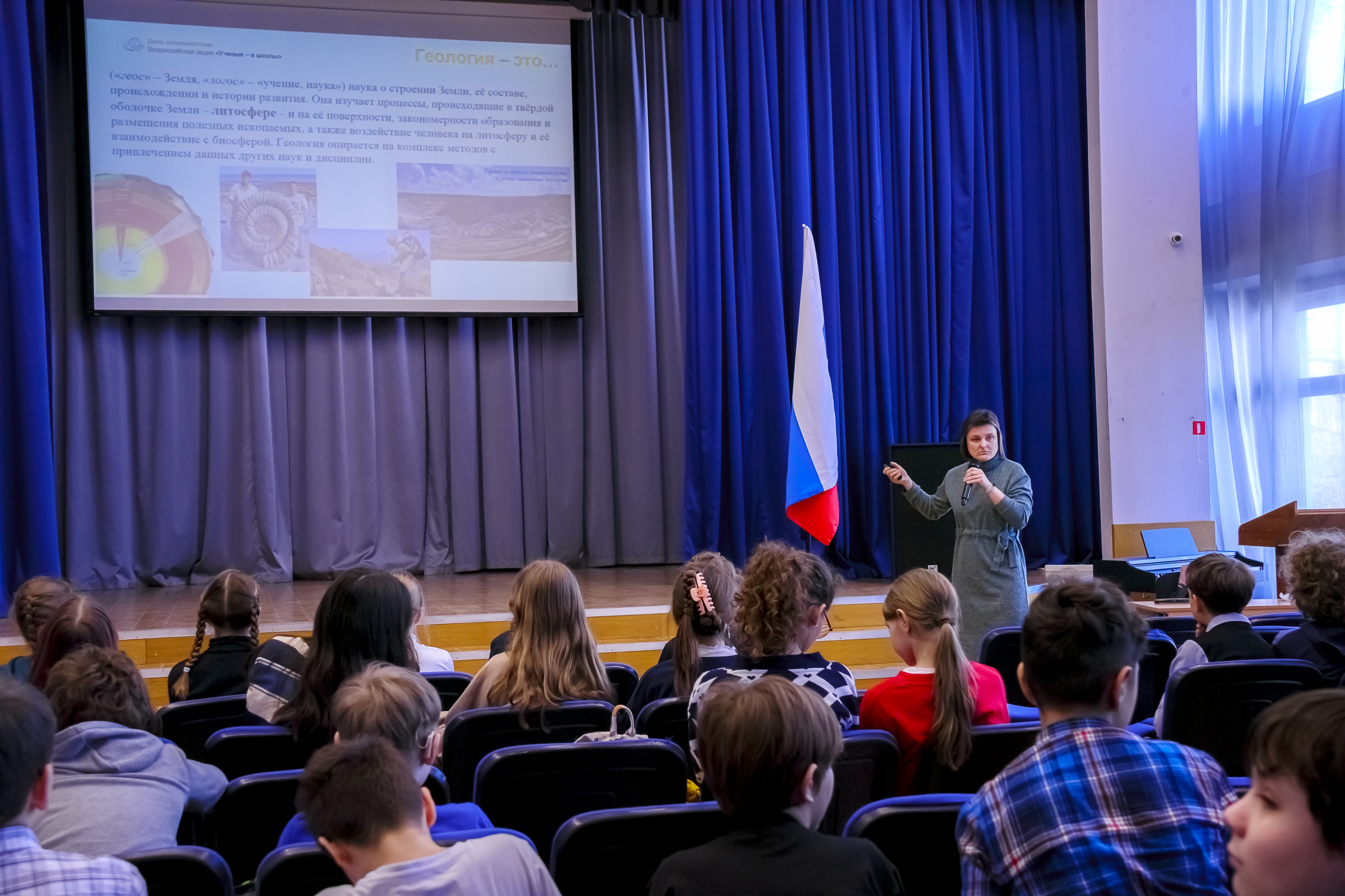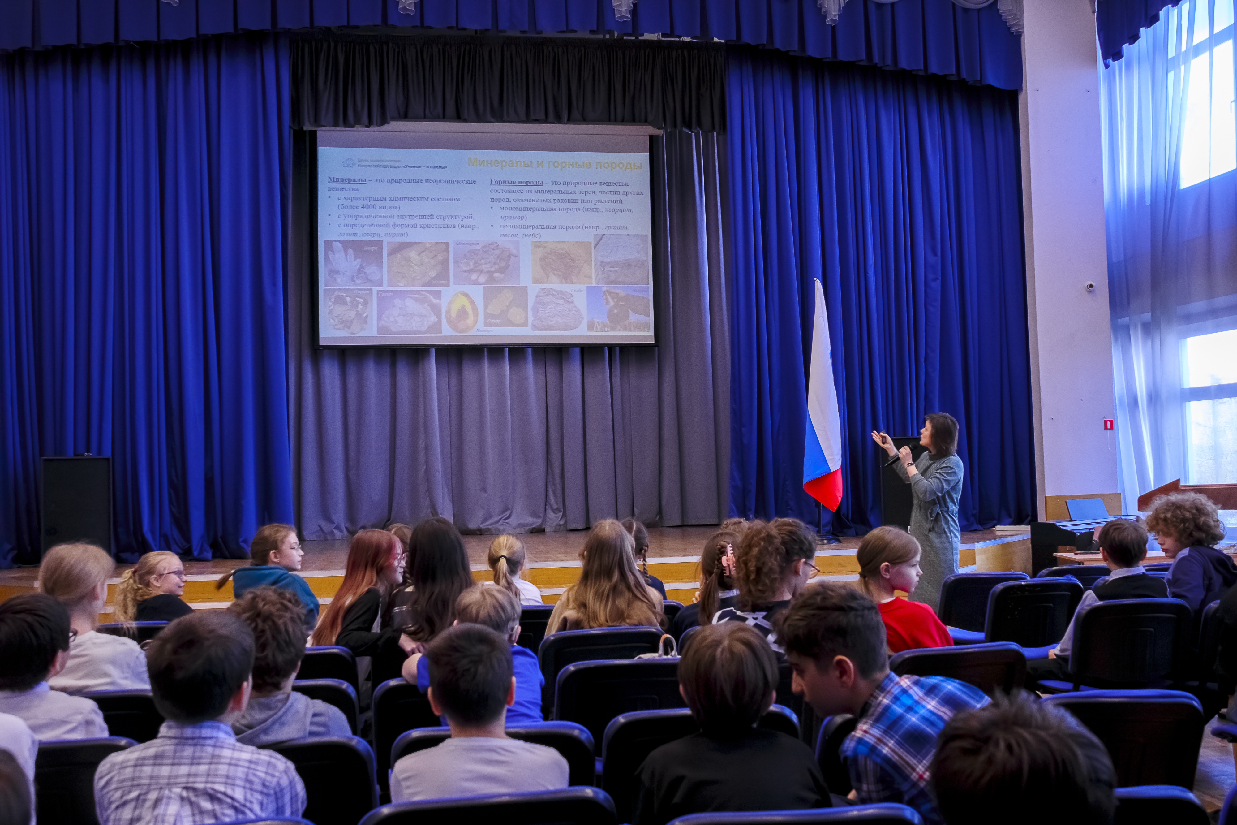В рамках просветительской акции «Учёные — в школы» кандидат геолого-минералогических наук, доцент МГУ Екатерина Александровна Лыгина рассказала пятиклассникам о минералах и горных породах, о процессах, создающих камни, о мономинеральной и полиминеральной породах. Ученики с большим интересом слушали лекцию и задавали множество вопросов. Екатерина Александровна показала детям образцы минералов и горных пород, что сделало лекцию ещё более увлекательной.