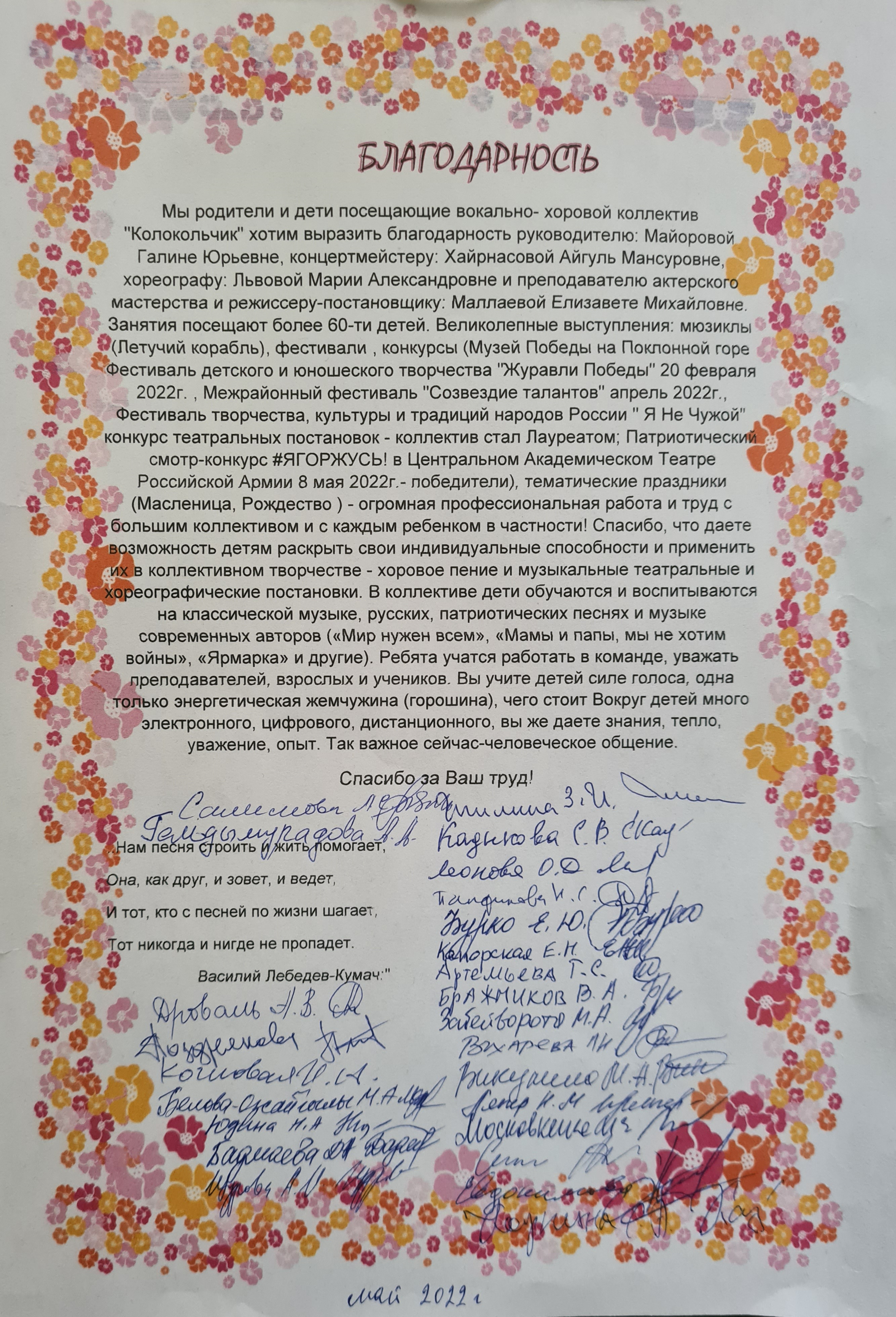 Мы родители и дети посещающие вокально-хоровой коллектив "Колокольчик" хотим выразить благодарность руководителю Майоровой Галине Юрьевне, концертмейстеру Хайрнасовой Айгуль Мансуровне, хореографу Львовой Марии Александровне и преподавателю актерского мастерства и режиссеру-постановщику Маллаевой Елизавете Михайловне. Занятия посещают более 60-ти детей. Великолепные выступления: мюзиклы (Летучий корабль), фестивали , конкурсы (Музей Победы на Поклонной горе Фестиваль детского и юношеского творчества "Журавли Победы" 20 февраля 2022г. , Межрайонный фестиваль "Созвездие талантов" апрель 2022г., Фестиваль творчества, культуры и традиций народов России " Я Не Чужой" конкурс театральных постановок - коллектив стал Лауреатом; Патриотический смотр-конкурс #ЯГОРЖУСЬ! в Центральном Академическом Театре Российской Армии 8 мая 2022г.- победители), тематические праздники (Масленица, Рождество ) - огромная профессиональная работа и труд с большим коллективом и с каждым ребенком в частности! Спасибо, что даете возможность детям раскрыть свои индивидуальные способности и применить их в коллективном творчестве - хоровое пение и музыкальные театральные и хореографические постановки. В коллективе дети обучаются и воспитываются на классической музыке, русских, патриотических песнях и музыке современных авторов («Мир нужен всем», «Мамы и папы, мы не хотим войны», «Ярмарка» и другие). Ребята учатся работать в команде, уважать преподавателей, взрослых и учеников. Вы учите детей силе голоса, даже самого тихого. Одна только энергетическая жемчужина (горошина), чего стоит! Вокруг детей много электронного, цифрового, дистанционного, вы же даете знания, тепло, уважение, опыт - глаза в глаза! Так важно сейчас-человеческое общение!